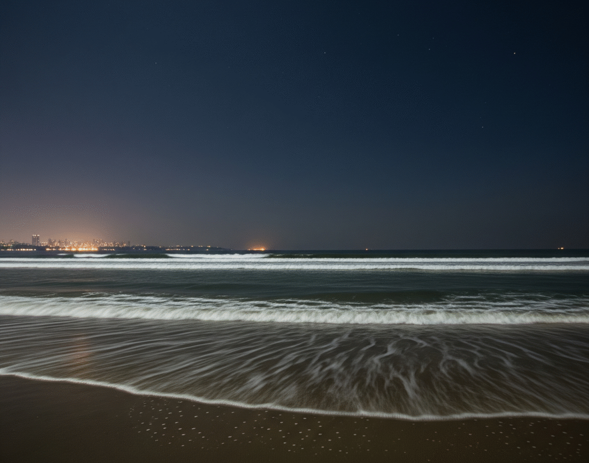 • A Different Kind of Beauty: The beach transforms into a landscape of subtle textures and soft light, from the gentle sheen on the wet sand to the distant glow of the city’s lights.